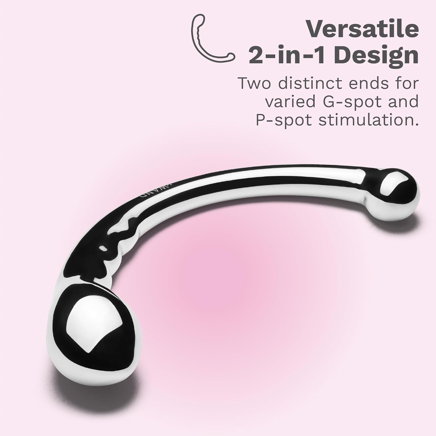 Lay back and relish in the depths of pleasure by yourself or with your partner with the Le Wand Hoop. The perfect curvature and ample reach of this stainless steel wand will leave you in awe with its satisfying weight and pressure. Allow the Hoop wand to firmly caress your pleasure spots in all the right way the Hoop features a beginner-friendly easy-to-insert small bulb and a larger bulbous teardrop end with ripples for an added delightful textured sensation. Both ends are excellent for mind-blowing G-spot and P-spot play. Stainless steel toys are prized for their hardness weight and hygiene. Plus they can be used with all types of lubricant. Try cooling them down or warming them up with water for temperature play. To clean simply use soap and water pop them in the dishwasher or boil them for 3 to 4 minutes to fully disinfect. 1.4 in. x 10.3 in. 1.39 lbs.