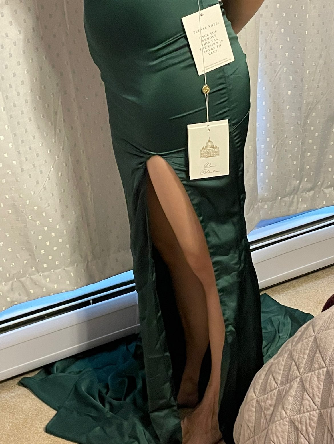 You will feel like a beauty queen in this gorgeous emerald gown. Described on the website as “a flattering neckline, side slit, mermaid train & lace-up back”. It’s the perfect dress for your night of celebrating. This dress was never worn. It was purchased for prom, then the pandemic happened - so there was no prom. She put it on only for pictures to sell. Please check the size chart provided from the website above (size small measurements) for the accurate dress size