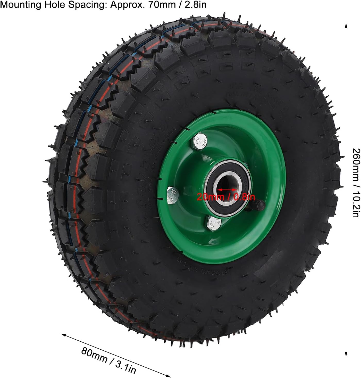 1. 10 Inch Replacement Wheel: Crafted with rubber material, this wheel has high strength and explosion resistance. Equipped with 6204 bearing, it ensures longevity and reliability, making it an ideal choice for heavy duty use 2. Non Slip Design: Featuring non slip tread pattern on the tire surface, this wheel provides exceptional grip and wear resistance, enhances security and stability across various terrains, ensuring a stable ride every time 3. Versatile Use: Perfectly suited for a wide range of applications, including trolleys, wheelbarrows, garden carts, etc., this 10 inch wheel with size of 260 x 80mm and 20mm inner diameter, meets to diverse mobility needs 4. 250KG Load Bearing: Crafted through meticulous design and manufacturing processes, this wheel ensures accurate fitment and optimal performance, guarantees reliability and longevity under load up to 250KG 5. Easy Install and Maintain: With its sturdy construction, this wheel eliminates the hassle of replacement, reducing maintenance needs, ensures seamless integration with your cart or trolley, enhancing user convenience Spec: Item Type: Cart Wheel Material: Rubber Specification: 4.10/3.50-4 Wheel Diameter: Approx. 260mm / 10.2in Wheel Width: Approx. 80mm / 3.1in Middle Shaft Hole: Approx. 20mm / 0.8in Mounting Hole Spacing: Approx. 70mm / 2.8in Single Load: Approx. 250KG / 551.2LB How to Use: Direct installation and use PackageList: 1 x Cart Wheel