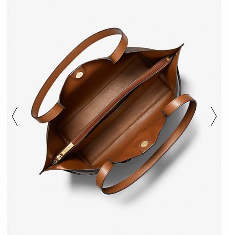 Our Emilia bag delivers grab-and-go glamour. Crafted from Signature-print canvas with belted detailing, this softly structured tote is spacious enough to hold a laptop and more. It features a center zip compartment for easy organization, as well as a long top handle that makes it a comfortable choice when commuting long distance.