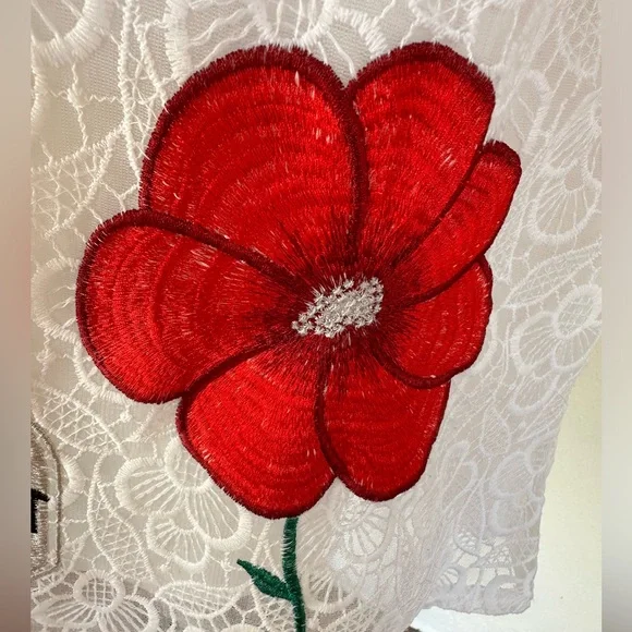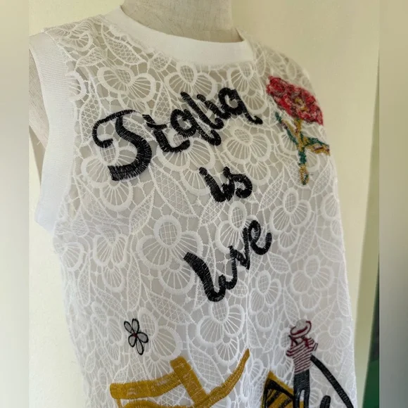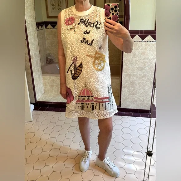 This is a vintage piece with no label, but she is adorable! Featuring some of the best Italian destinations and symbols, this embroidered A line dress is one of a kind. No one else will be dressed like you at the party or on vacation! Cute with sneakers or ballet flats, and even a red high heel for evening. Comes with a slip. Zips up the back. She fits me as a size 6, but could go up to an 8. Please go by the measurements to be sure. Bust to 37”Waist to 38”Hips to 42”length from shoulder to hem: 33.5