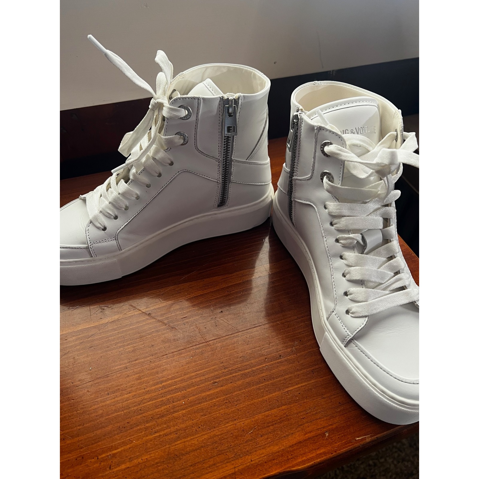 Stylish and fashionable sneakers, exhibiting a high-top silhouette with a lace-up design complemented by a convenient side zipper for easy wear. These pristine white sneakers feature the brand's name subtly embossed on the side, with the distinctive lightning bolt symbol at the back, adding a touch of edge. The design incorporates silver-tone eyelets that accentuate the clean lines, while the platform sole provides a modern lift. The overall aesthetic captures a blend of minimalist elegance and contemporary flair, complete with tonal stitching and a cushioned interior for added comfort.